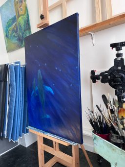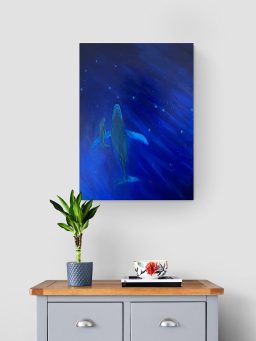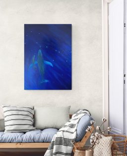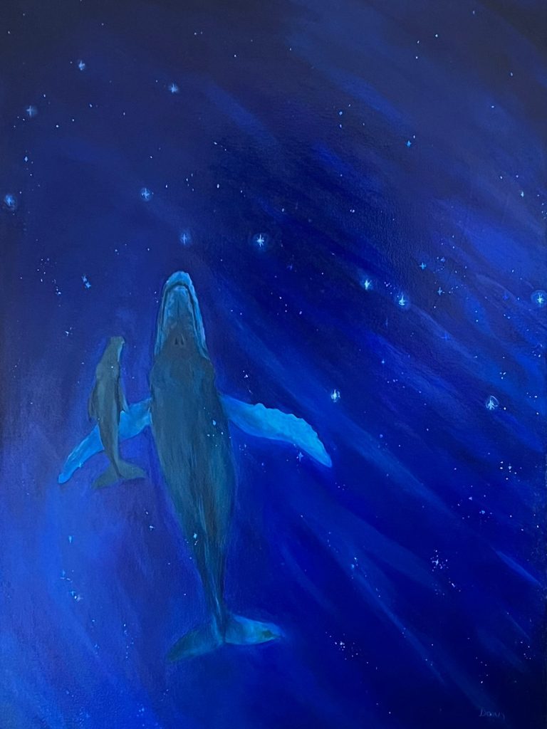 This dreamlike original oil painting merges elements of the ocean and cosmos, depicting a mother humpback whale and her calf within a celestial tapestry of deep blues, turquoise, and purple, evoking both the night sky and ocean depths, and adorned with tiny star-like lights. Layers of multicolored glazes create a dynamic effect, altering the appearance under different lighting conditions—sometimes darker, sometimes glowing, shifting between blue and teal. A distinctive feature of this piece is the constellation Cetus, subtly woven into the pattern of reflected stars. This harmonious blend of marine and celestial motifs invites contemplation of the mystery and majesty of nature and the universe.