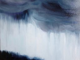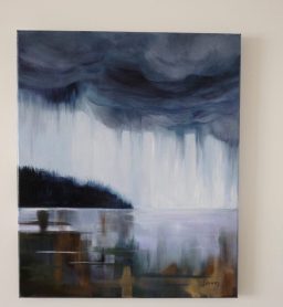 I tried to employ the textures of the paint and linen, metallics and numerous glazes to convey the atmospheric light of morning drizzle and mist trapped under rain clouds.