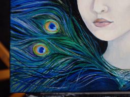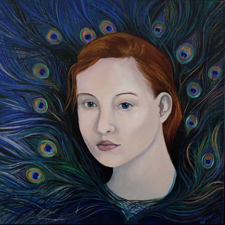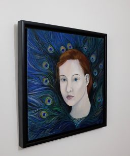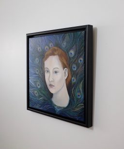 A one-off original study of a woman’s features and luminous skin surrounded by peacock feathers. It is painted in high quality oil paints on a square stretched canvas and presented in a black floater frame ready to hang straight onto your wall.