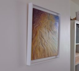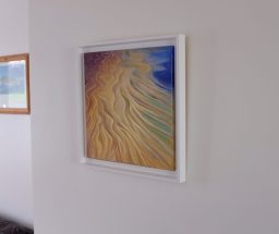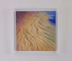 A dreamy abstracted study of the shifting colours in the light on wet sand ripples using high quality oil paint on stretched canvas. This picture has been painted on the sides and is presented in a white stepped floater frame. A coat of varnish has been applied to protect the paint surface. The work is signed on the front. A catalogued certificate of authenticity is included.