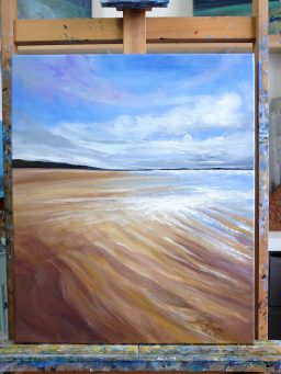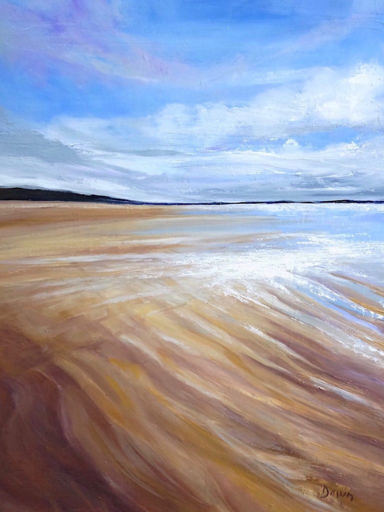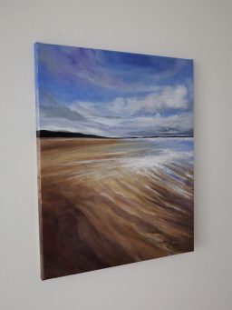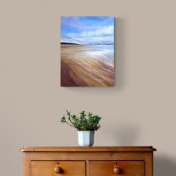 The Edge of the Tide is an original one-off coastal landscape painting that captures the wild windswept beauty of the North Devon coast. I use high quality oil paints on hand stretched and primed canvas to depict a tranquil scene, with a vast, open sky in soft, pastel colours transitioning to a calm sea rendered in darker shades of blue. The foreground showcases the wet sand with rhythmic, angular brushstrokes that convey its reflective quality, while the interchange of light and shadow creates a feeling of depth and motion. The overall effect of the artwork is soothing and immerses the viewer in a moment of natural coastal beauty.