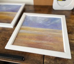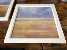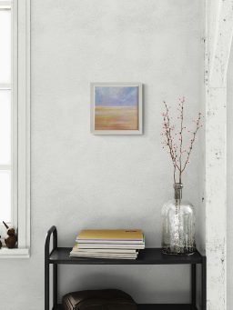 A small abstracted square of calmness using multiple glazes and impasto textured oil paint on canvas board. It depicts a sandy beach emerging from a short spell of rain.